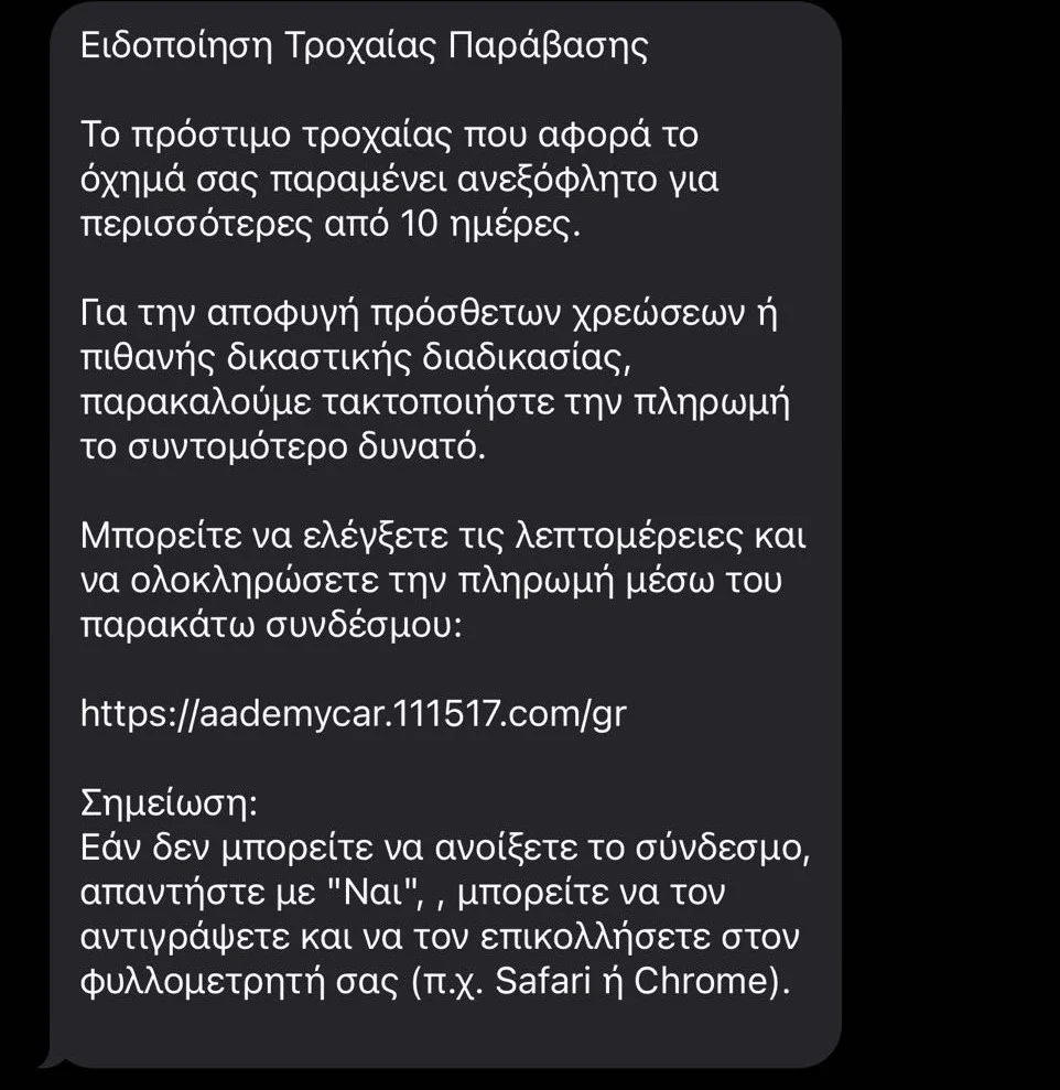 «Με αφορμή περιστατικά αποστολής παραπλανητικών μηνυμάτων (SMS) σε πολίτες, τα οποία εμφανίζονται ως δήθεν «ειδοποίηση τροχαίας παράβασης» και περιέχουν σύνδεσμο για πληρωμή προστίμου, επισημαίνεται ότι τα εν λόγω μηνύματα δεν ανταποκρίνονται στην πραγματικότητα και αποσκοπούν στην εξαπάτηση των πολιτών.