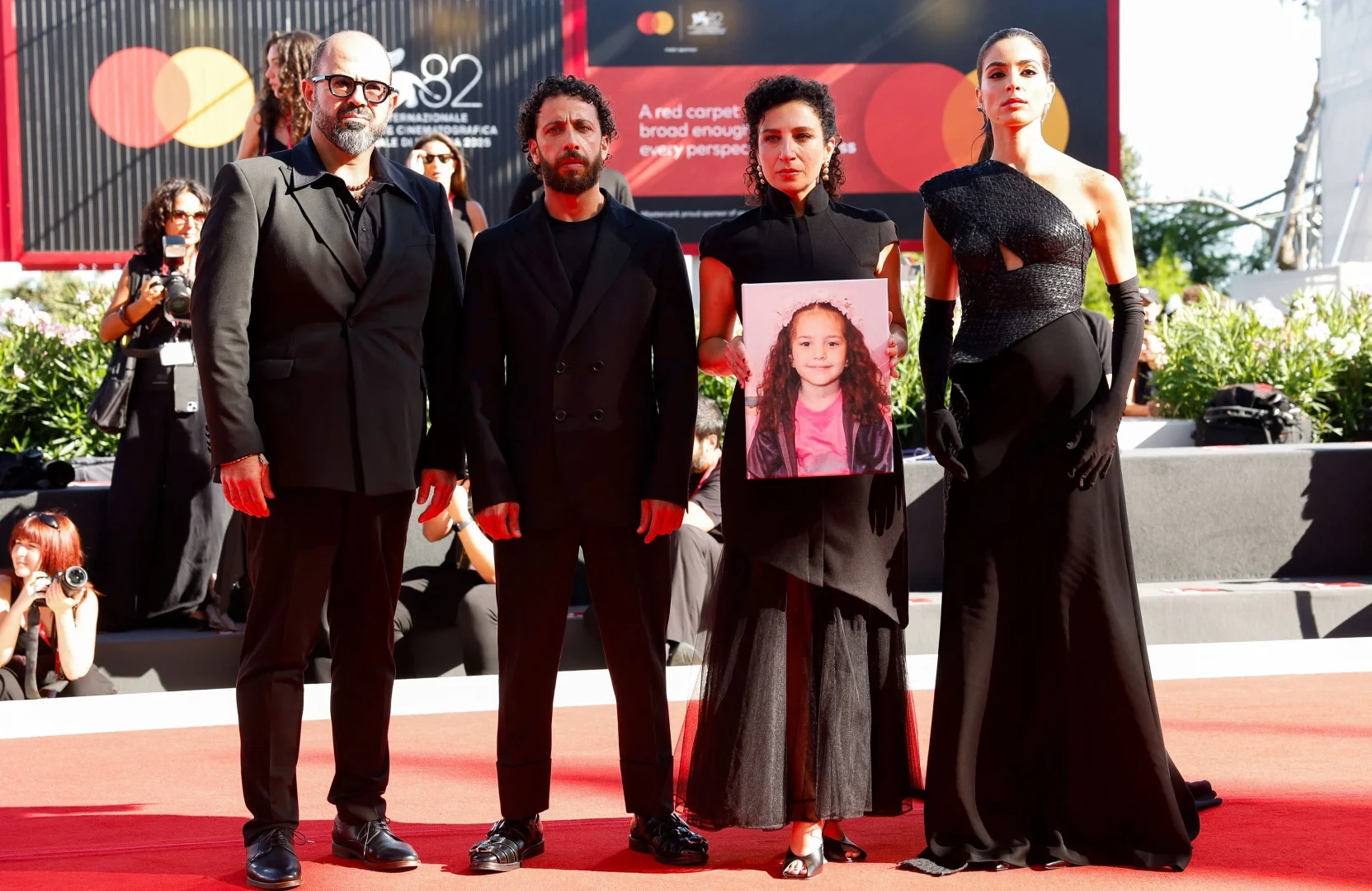 Οι Amer Hlehel, Clara Khoury, Motaz Malhees και Saja Kilani ποζάρουν στο κόκκινο χαλί με μια φωτογραφία της Hind Rajab κατά την άφιξή τους στην προβολή της ταινίας «The Voice of Hind Rajab», που συμμετείχε στο διαγωνιστικό τμήμα, στο 82ο Φεστιβάλ Κινηματογράφου της Βενετίας, Ιταλία, 3 Σεπτεμβρίου 2025. REUTERS/Remo Casilli