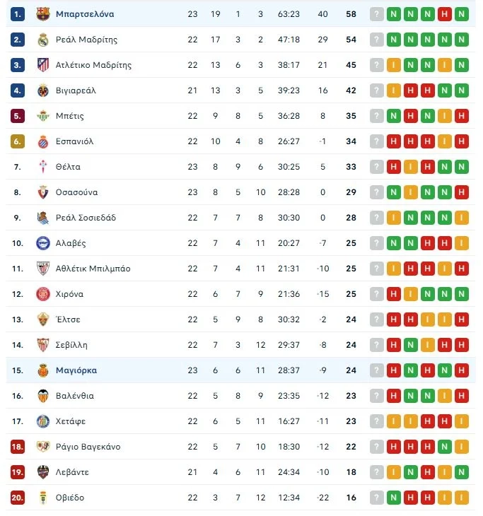 Από την άλλη η Μαγιόρκα κατρακύλησε στην 15η θέση έχοντας 24 βαθμούς και έχει μπλέξει στην υπόθεση παραμονής, καθώς η 18η Ράγιο Βαγιεκάνο, έχει 22 πόντους.