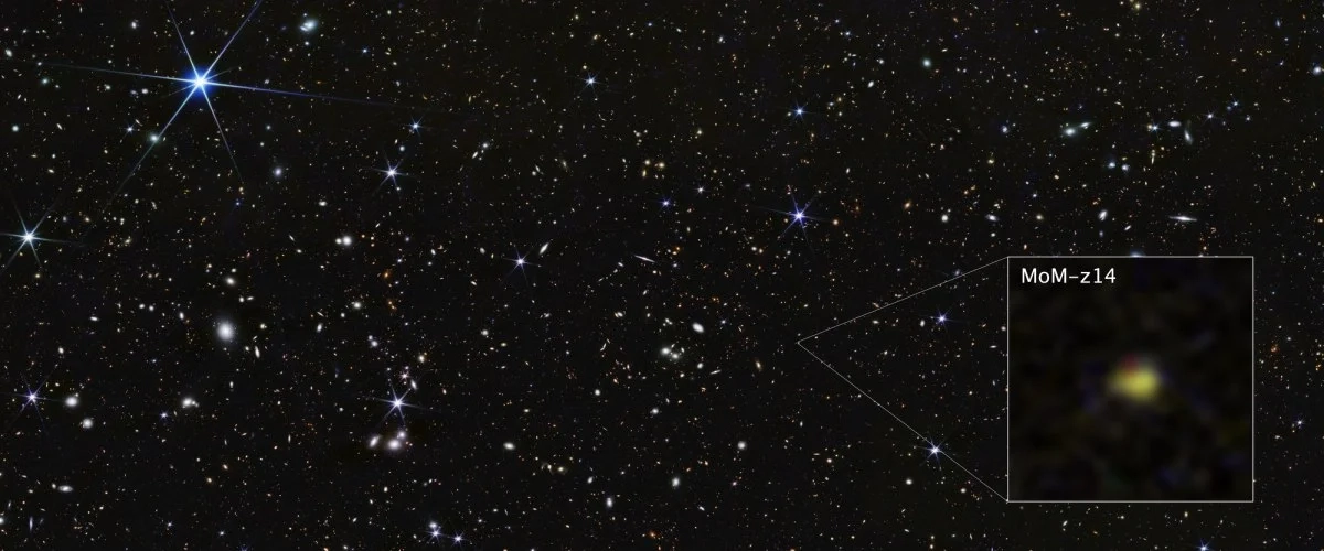 Ο MoM-z14 είναι ένας από τους εκατοντάδες γαλαξίες που ανακαλύφθηκαν από το James Webb στο νεαρό Σύμπαν και εξέπληξαν τους επιστήμονες με τη φωτεινότητά τους. Τα ευρήματα υποδεικνύουν ότι οι πρώτοι γαλαξίες σχηματίστηκαν πολύ νωρίτερα από ό,τι πιστεύαμε.