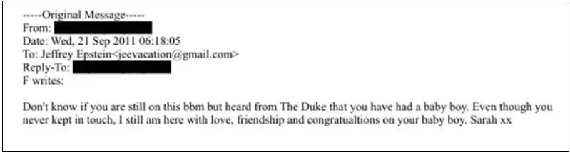 Η πρώην Δούκισσα του Γιορκ χρησιμοποίησε τη γέννηση του παιδιού ως δικαιολογία για να επικοινωνήσει ξανά με τον Επστάιν, ακόμη και μετά την αποφυλάκισή του για σεξουαλικά αδικήματα κατά παιδιών – και του πρόσφερε την «αγάπη, τη φιλία και τα συγχαρητήριά της». Έγραφε στο email, το οποίο κυκλοφόρησε στην τελευταία σειρά των αρχείων: «Δεν ξέρω αν χρησιμοποιείς ακόμα αυτό το BBM [BlackBerry Messenger], αλλά άκουσα από τον δούκα ότι απέκτησες αγοράκι».