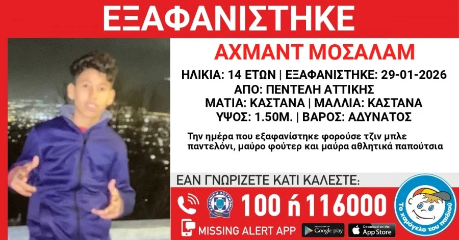 Στις 29/01/2026 και ώρα περίπου 6:00 π.μ., εξαφανίστηκε από χώρο φιλοξενίας ασυνόδευτων ανηλίκων στην Πεντέλη Αττικής, ο Μοσαλάμ (επ) Αχμάντ (ον), 14 ετών, με καταγωγή από την Αίγυπτο. Το «Χαμόγελο του Παιδιού» ενημερώθηκε σήμερα 30/01/2026 και άμεσα προχώρησε στην δημοσιοποίηση των στοιχείων του, καθώς ενδεχομένως συντρέχουν λόγοι που θέτουν την ζωή του σε κίνδυνο. Ο Μοσαλάμ (επ) Αχμάντ (ον) έχει ύψος 1,50 μ., είναι αδύνατος, έχει καστανά μαλλιά και καστανά μάτια. Την ημέρα που εξαφανίστηκε φορούσε τζιν μπλε παντελόνι, μαύρο φούτερ και μαύρα αθλητικά παπούτσια
