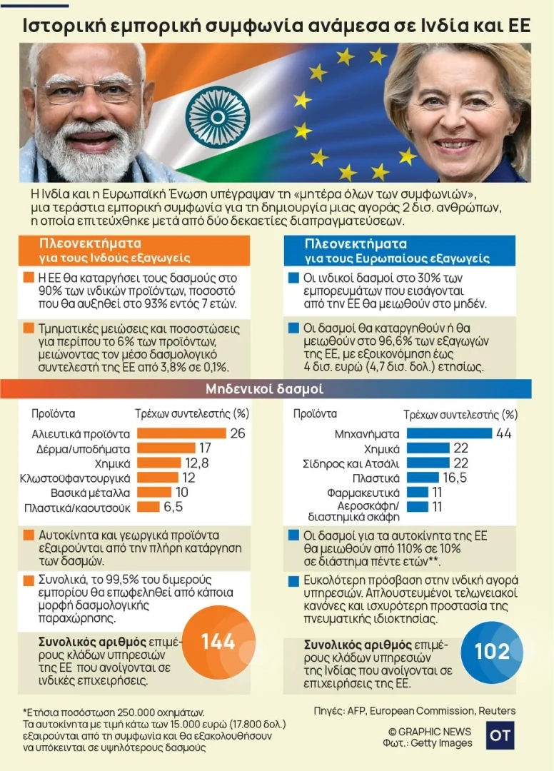 «Η μητέρα όλων των συμφωνιών», δήλωσε ο Ινδος πρωθυπουργος Ναρέντρα Μόντι την περασμένη Τρίτη στην πρωτεύουσα Νέο Δελχί, όπου συναντήθηκε με την πρόεδρο της Ευρωπαϊκής Επιτροπής Ούρσουλα φον ντερ Λάιεν και τον πρόεδρο του Ευρωπαϊκού Συμβουλίου Αντόνιο Κόστα.