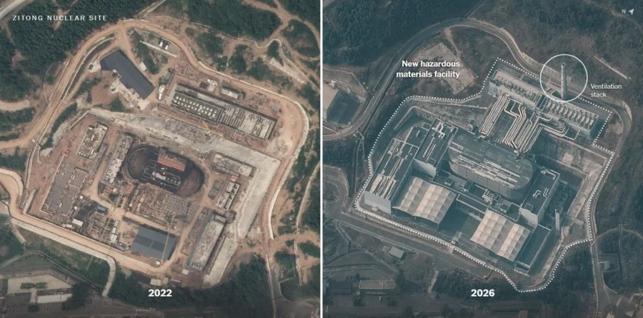 Η πυρηνική εγκατάσταση στο Ζιτονγκ της Κίνας το 2022 (αριστερά) και τα νέα κτίρια που έχουν προστεθεί φαίνονται δεξιά στην εικόνα του 2026.