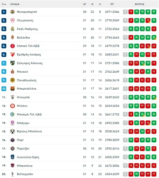Τα αποτελέσματα της 31ης αγωνιστικής της Euroleague:
