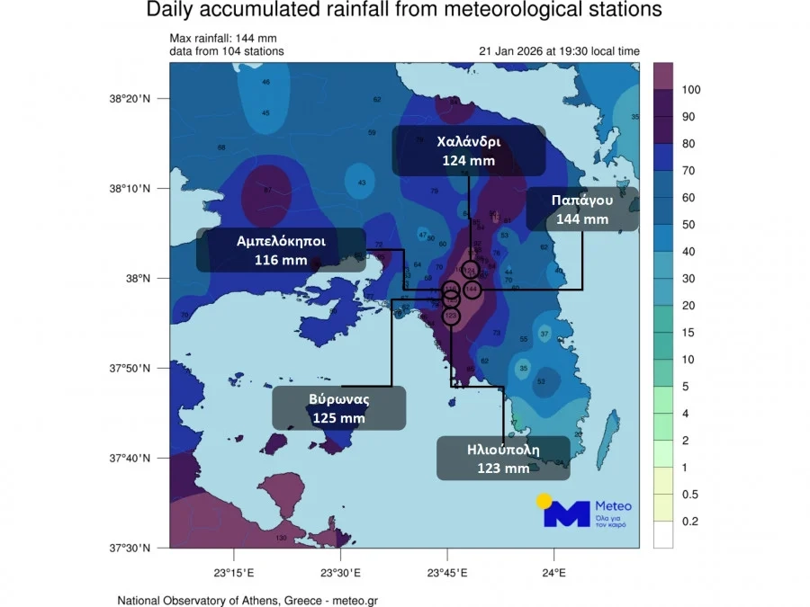 Τα μεγαλύτερα ύψη βροχής μέχρι τις 20:00 καταγράφηκαν στην περιοχή Παπάγου Αττικής με 146.4mm, ακολουθεί η Τακτικούπολη Τριζοινίας με 130.4mm και ο Βύρωνας Αττικής με 126.4mm