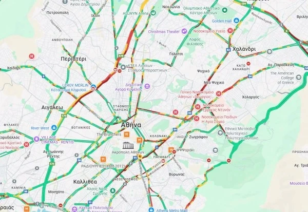 Στο «κόκκινο» βρίσκεται ο Κηφισός, όπου παρατηρείται έντονη συμφόρηση από Νέα Ιωνία έως τα ΚΤΕΛ, ενώ αυξημένη είναι η κίνηση και στην Κηφισίας, στη Μεσογείων, στην Πέτρου Ράλλη, στην Αλεξάνδρας, στην Κατεχάκη, στη Βασ. Σοφίας, στη Βασ. Κωνσταντίνου, στην Καλλιρόης, στη Συγγρού, στην Ηλιουπόλεως, στην Ποσειδώνος, στη Λ. Σχιστού προς Σκαραμαγκά, στη Βάρης Κορωπίου και στην Περιφερειακή Καρέα από Ηλιούπολη.