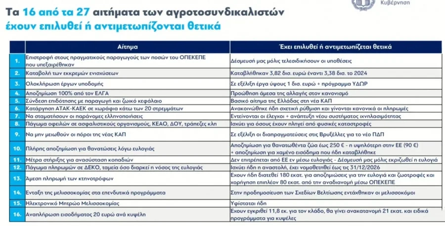 - Παρουσίασε αναλυτικά τα αιτήματα που έχουν καταθέσει οι αγρότες και την τοποθέτηση της κυβέρνησης για ένα προς ένα από αυτά. Πρόκειται για 27 αιτήματα από τα οποία τα 16 έχουν επιλυθεί ή αντιμετωπίζονται θετικά, 4 απαντήθηκαν σήμερα επίσης θετικά και 7 είναι εκτός δημοσιονομικών ορίων ή ευρωπαϊκού πλαισίου.