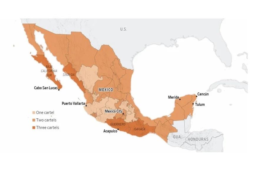 Τα τρία μεγάλα καρτέλ του Μεξικού ελέγχουν περιοχές που περιλαμβάνουν μερικά από τα πιο δημοφιλή τουριστικά σημεία της χώρας. Η Χαλίσκο και η Σιναλόα έχουν παρουσία στην πολιτεία Κιντάνα Ρόο, όπου βρίσκονται παραθαλάσσιοι προορισμοί όπως το Κανκούν και το Τουλούμ. Το Κάμπο Σαν Λούκας στην Μπάχα Καλιφόρνια βρίσκεται σε μια περιοχή με τρία καρτέλ. Και το Πουέρτο Βαγιάρτα, δημοφιλής πόλος έλξης για Αμερικανούς συνταξιούχους, βρίσκεται στην καρδιά της περιοχής του Χαλίσκο.