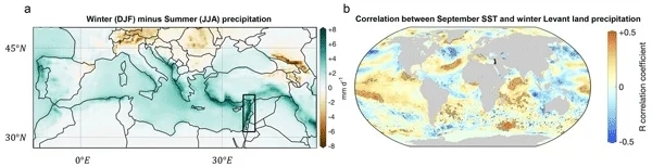 Μια επαναστατική μελέτη που δημοσιεύθηκε στο περιοδικό Weather and Climate Dynamics φέρνει στο φως έναν άγνωστο μέχρι σήμερα κλιματικό «πρόδρομο» στη Μεσόγειο Θάλασσα, ικανό να προβλέψει τα επίπεδα των χειμερινών βροχοπτώσεων στην περιοχή του Λεβάντε (Ισραήλ, Παλαιστίνη, Λίβανος, Συρία) αρκετούς μήνες πριν την έναρξη της εποχής.