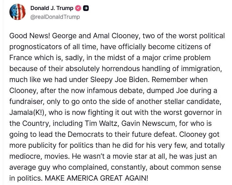 «Καλά νέα! Ο Τζορτζ και η Αμάλ Κλούνεϊ , δύο από τους χειρότερους πολιτικούς προγνώστες όλων των εποχών, έγιναν επίσημα Γάλλοι πολίτες», έγραψε ο Ντόναλντ Τραμπ στο δίκτυό του Truth Social.