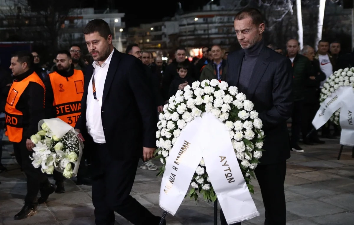Ο Αλεξάντερ Τσέφεριν ως πρόεδρος της UEFA και ο Μάκης Γκαγκάτσης ως πρόεδρος της ΕΠΟ κατέθεσαν στεφάνι στη μνήμη των οπαδών του ΠΑΟΚ που σκοτώθηκαν σε τροχαίο δυστύχημα στη Ρουμανία.
