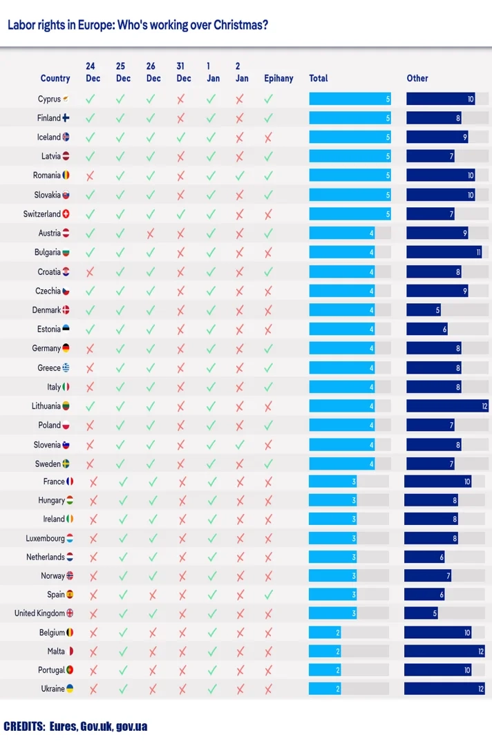 Από τον αριθμό των αμειβόμενων ημερών άδειας έως το ύψος του χριστουγεννιάτικου επιδόματος, δεν είναι όλες οι ευρωπαϊκές χώρες ίσες για τους εργαζόμενους κατά τη διάρκεια των διακοπών. Πέραν των ξωτικών του Βόρειου Πόλου και του αγαπημένου Άγιου Βασίλη, υπάρχουν πολλοί ακόμη που συνεχίζουν να εργάζονται τις τελευταίες εβδομάδες του έτους, και συχνά και μέσα στις γιορτές των Χριστουγέννων.
