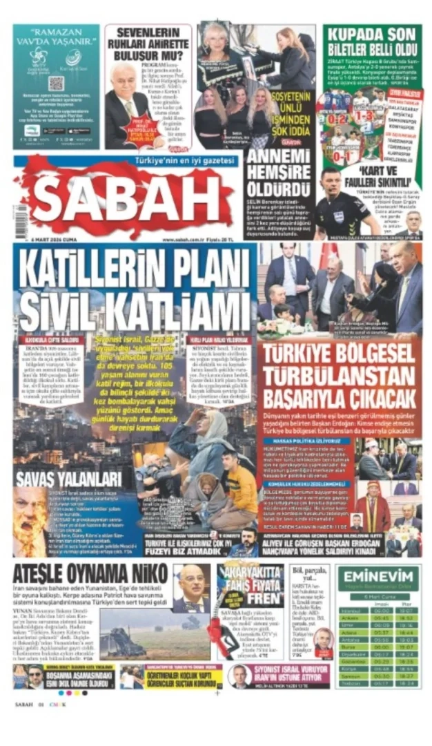 Η Sabbah προειδοποιεί τον Νίκο Δένδια ότι παίζει με τη φωτιά και κατηγορεί την Ελλάδα ότι χρησιμοποιεί ως πρόσχημα τον πόλεμο στο Ιράν για να δημιουργήσει τετελεσμένα στο Αιγαίο. «Χρησιμοποιώντας τον πόλεμο στο Ιράν ως πρόσχημα η Ελλάδα έχει ξεκινήσει ένα επικίνδυνο παιχνίδι στο Αιγαίο», γράφει η τουρκική εφημερίδα.
