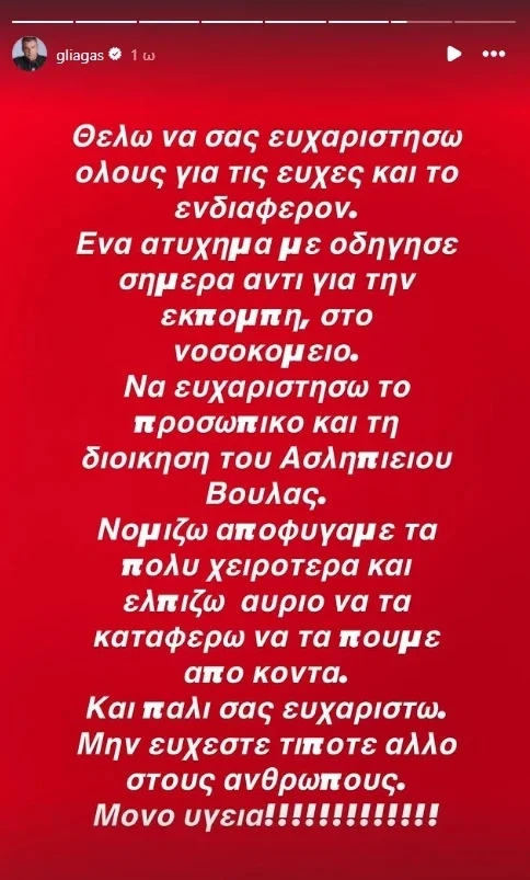 «Θέλω να σας ευχαριστήσω όλους για τις ευχές και το ενδιαφέρον. Ένα ατύχημα με οδήγησε σήμερα αντί για την εκπομπή στο νοσοκομείο. Να ευχαριστήσω το προσωπικό και τη διοίκηση του Ασκληπιειού Βούλας. Νομίζω αποφύγαμε τα πολύ χειρότερα και ελπίζω αύριο να τα καταφέρω να τα πούμε από κοντά. Και πάλι σας ευχαριστώ. Μην εύχεστε τίποτα άλλο στους ανθρώπους. Μόνο υγεία!», έγραψε χαρακτηριστικά, δίνοντας το στίγμα της κατάστασής του.