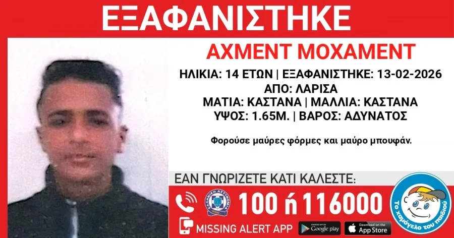 Το Χαμόγελο του Παιδιού ενημερώθηκε σήμερα 09/02/2026 και προχώρησε άμεσα σε δημοσιοποίηση των στοιχείων, κατόπιν εισαγγελικής εντολής, καθώς ενδέχεται να συντρέχουν λόγοι οι οποίοι θέτουν την ζωή του σε κίνδυνο.