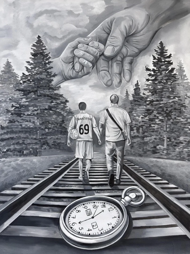 Η τοιχογραφία είναι αφιερωμένη σε δύο από τα θύματα της σιδηροδρομικής τραγωδίας στα Τέμπη. Στον 15χρονο τότε Παναγιώτη Μπουρναζή και τον πατέρα του που έχασαν τη ζωή τους μαζί με 55 ακόμη άτομα στη μοιραία σύγκρουση.