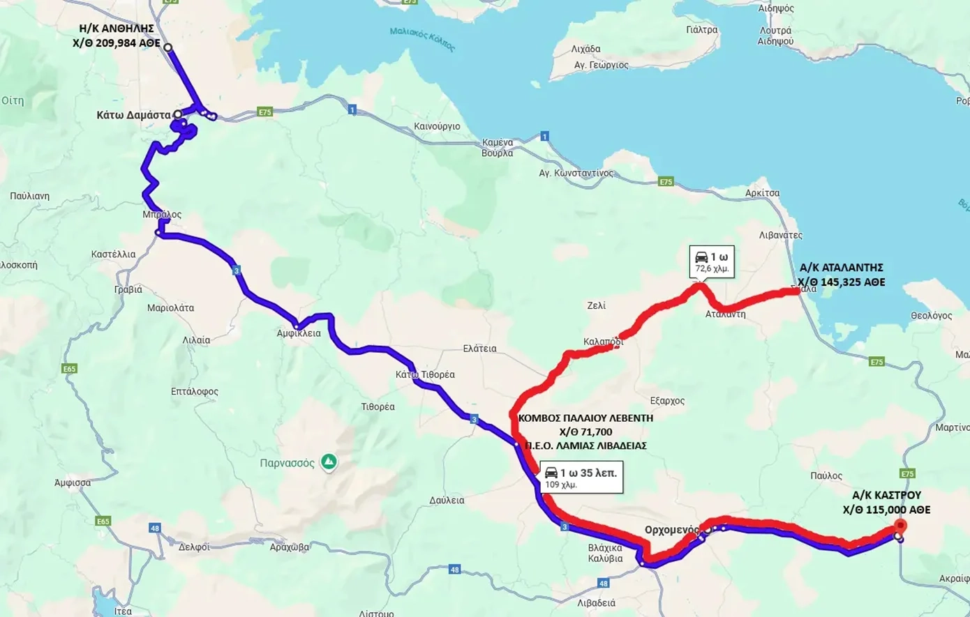 1) έξοδος από τον Αυτοκινητόδρομο στον Η/Κ Ανθήλης και κινούμενοι μέσω Μπράλου, Αμφίκλειας, Κάτω Τιθορέας, Ορχομενού να εισέρχονται στον Α/Κ Κάστρου (επισυνάπτεται σχετική οπτική απεικόνιση)