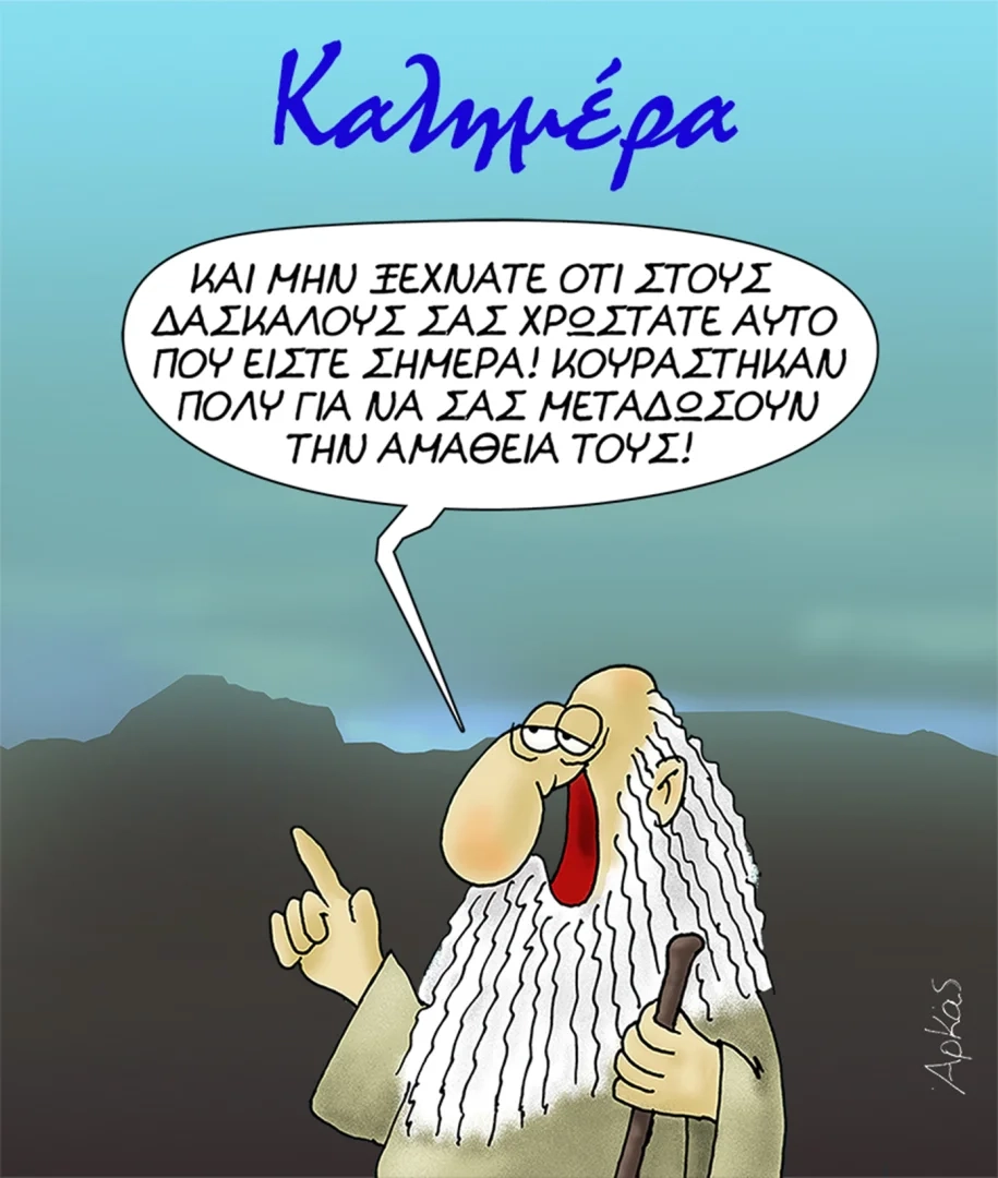 Αυτά είναι τα σημερινά λόγια του Προφήτη του Αρκά, με τα οποία λέει την «καλημέρα» του στους διαδικτυακούς «φίλους» του σκιτσογράφου στο Facebook.
